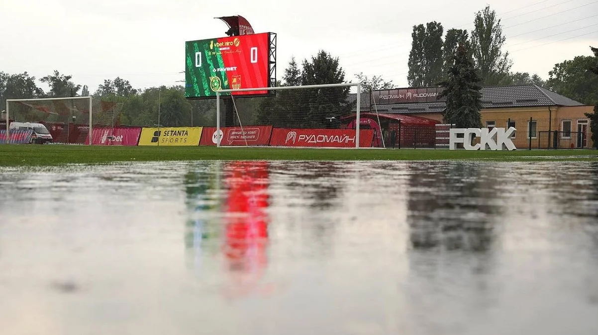 Стартовый свисток на стадионе Горняк в Кривом Роге должен был прозвучать в 15:00, но у погоды были свои планы. Сильный дождь сделал газон непригодным для футбольного матча.