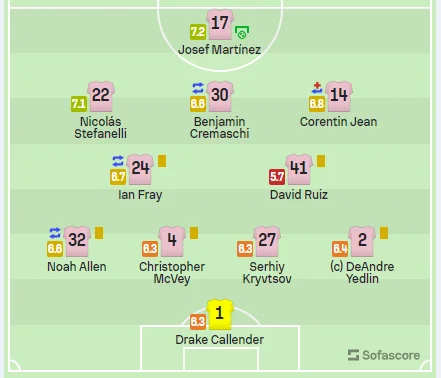 Украинский защитник Сергей Кривцов вышел в старте и провел на поле весь матч. За свою игру наш соотечественник удостоился от статистического портала SofaScore четвертой худшей оценки в команде – 6,3. Столько же заработали защитник Кристофер МакВей и кипер Дрейк Каллендер. Меньше только у полузащитника Давида Руиса (5,9). За время, проведенное на поле, Кривцов 74 раза коснулся мяча, выиграл одну воздушную дуэль, дважды из трех попыток победил в борьбе за позицию, отдал 5 из 10 точных передач, нанес один неточный удар, восемь раз терял мяч, один раз сфолил и дважды заработал нарушение на себе, совершил 3 выноса, а точность его передач в целом составила 88%.