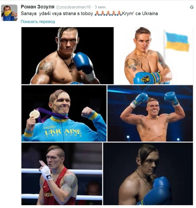 "Саша, удачи! Вся страна с тобой. Крым - это Украина", - написал Зозуля на своей странице в Twitter.
