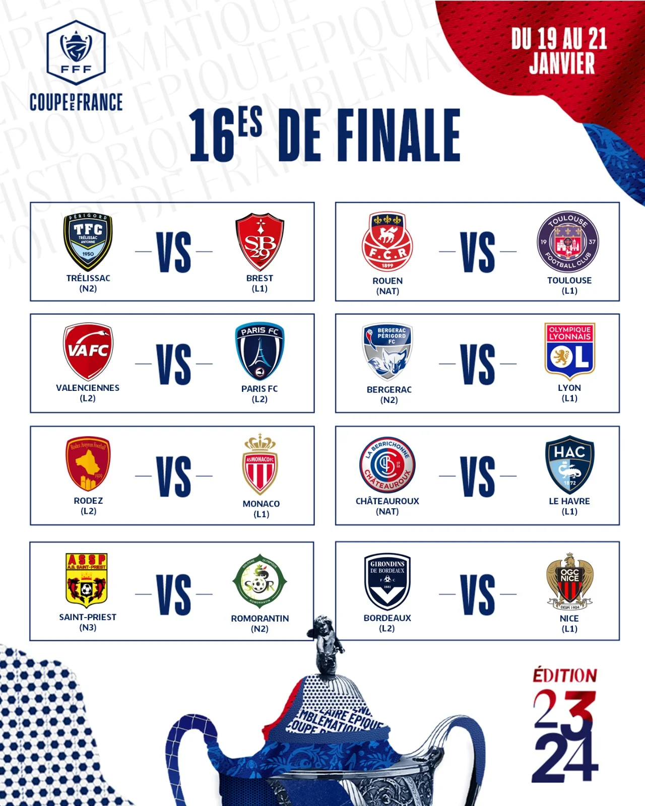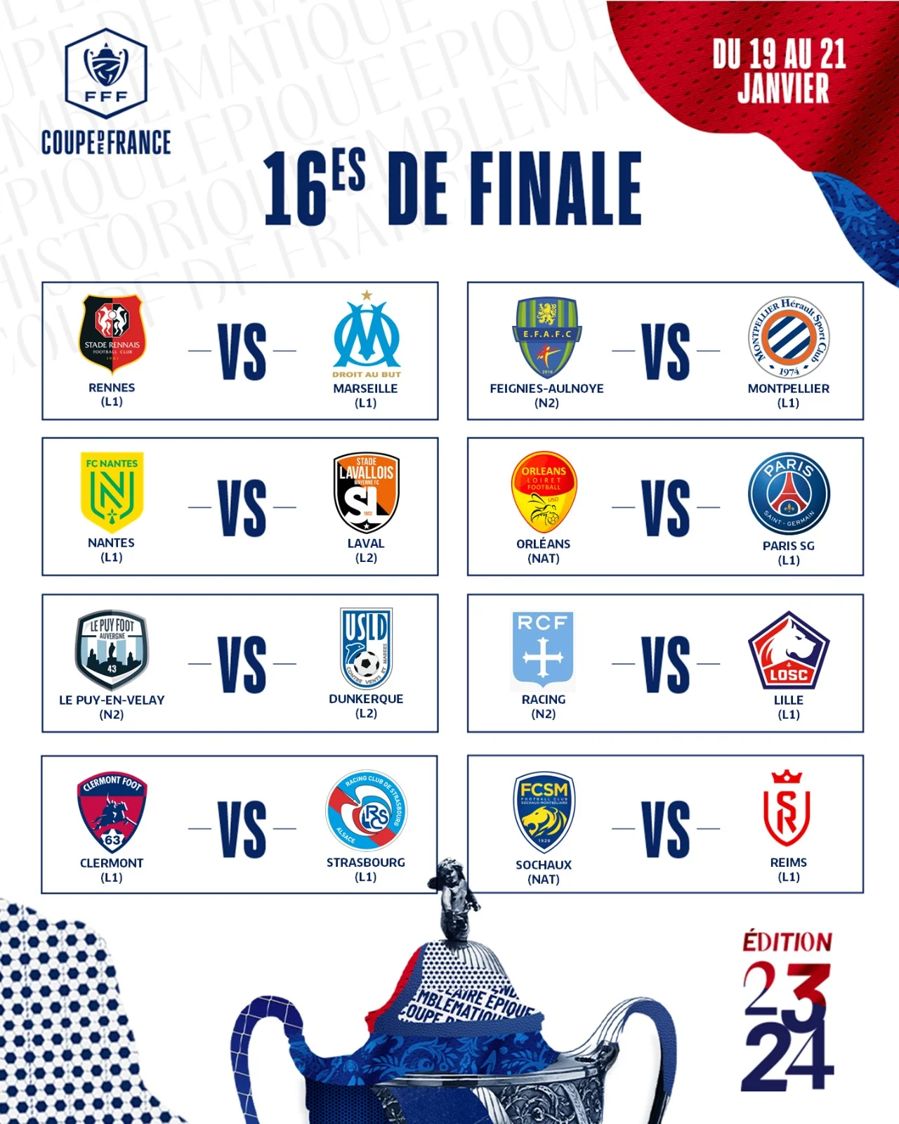 В понедельник, 8 января, состоялась жеребьёвка 1/16 финала Кубка Франции.