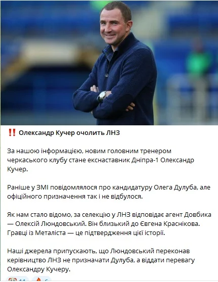 После отставки Александра Ковпака фаворитом на назначение главным тренером ЛНЗ был Олег Дулуб, последним место работы которого был Львов. Но новым наставником черкасской команды станет не он, а Александр Кучер, утверждает ВЗБІРНА.
