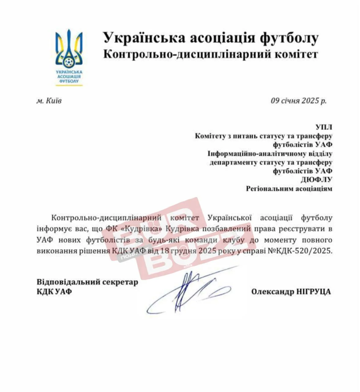 Заявлять новых футболистов Кудривке будет разрешено лишь после погашения долга.