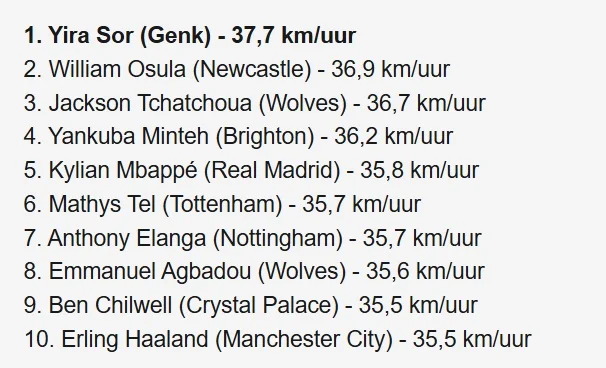 Это самая большая скорость, которую за последние 2 года фиксировали в чемпионатах Бельгии, Англии и ЛЧ. Сор на целых 800 метров в час обогнал предыдущего лидера, Вильяма Осулу из Ньюкасла. В топ-10 также есть звездные Эрлинг Холанд и Килиан Мбаппе, однако они совсем безнадежно отстали от игрока Генка.
