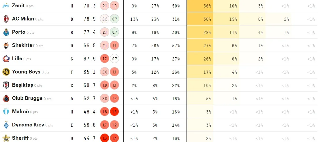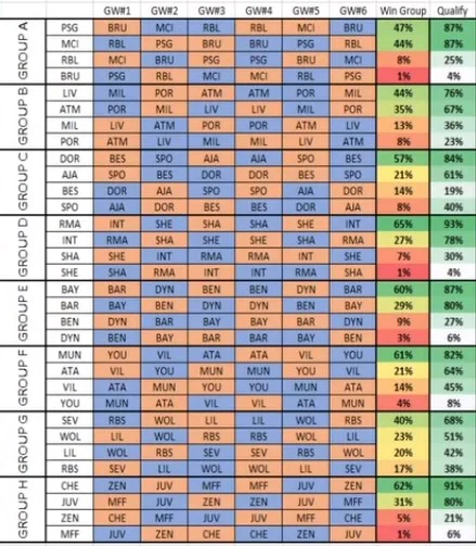 Як не дивно, але FiveThirtyEight бачить фаворитом на завоювання першого місця Аякс (46%). У Борусії на 8% менше. Десь таке ж співвідношення на вихід у плей-офф (78% на амстердамців і 72% на дортмундців). Спортінг – така собі темна конячка (40% на прохід). Все ж погані команди чемпіонат Португалії не виграють. Питання, чи зможе Лісабон підтвердити свої амбіції. Наразі йде дуже важко: нічия з аутсайдером, мирова з Порту в більшості. Ну, а Бешикташ вважають 5 найбільшим аутсайдером (всього 10% на вихід в 1/8).