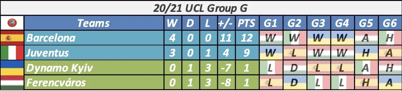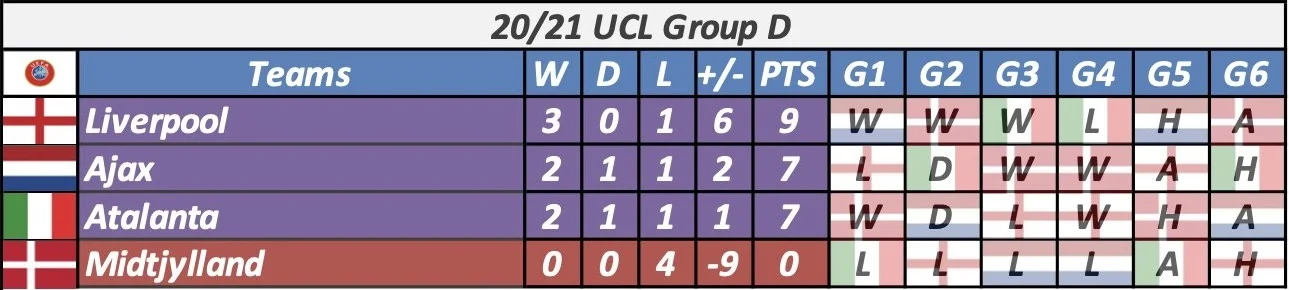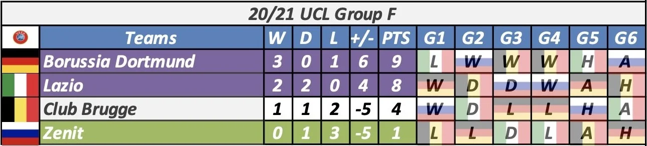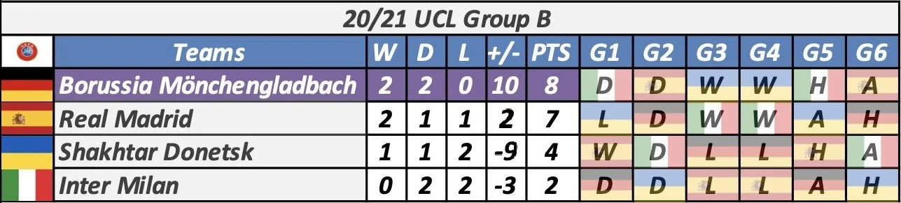 Ключ к таблицам. Голубой цвет – уже в плей-офф; фиолетовый – команда гарантировала себе как минимум третье место; зеленый – шансы только на Лигу Европы; красный – последнее место в группе. W – победа, D – ничья, L – поражение, PTS – очки, H – домашняя игра, A – выезд.