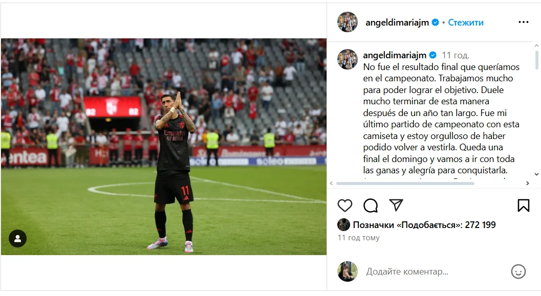 "Это был не тот конечный результат, которого мы хотели в чемпионате. Мы упорно работали, чтобы достичь цели. Очень больно заканчивать таким образом после такого долгого года. Это была моя последняя игра в чемпионате в этой футболке, и я горжусь тем, что смог снова ее одеть. В воскресенье нас ждет еще один финал, и мы выложимся на полную и победим в нем всем сердцем и душой. Как всегда – вместе. Спасибо за поддержку болельщикам Бенфики", – написал аргентинец.