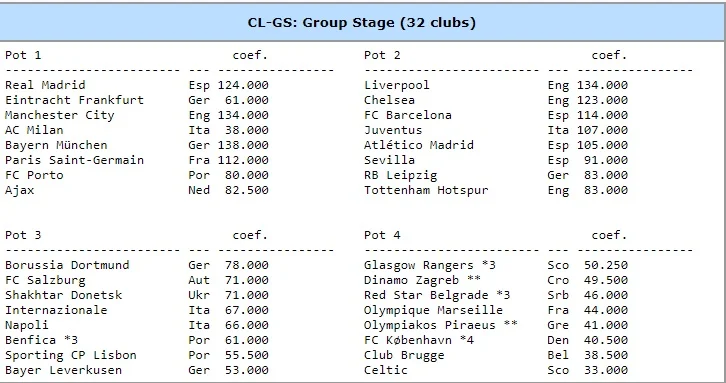 Лига чемпионов 2022/23: состав корзин группового турнира по состоянию на 29 мая 2022