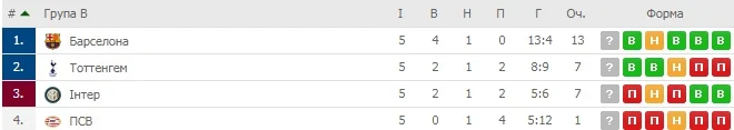 В итоге, обе команды имеют по 7 очков, впереди Тоттенхэм по результатам личных встреч. В последнем туре лондонцы отправятся в гости к Барселоне, а Интер будет принимать ПСВ.