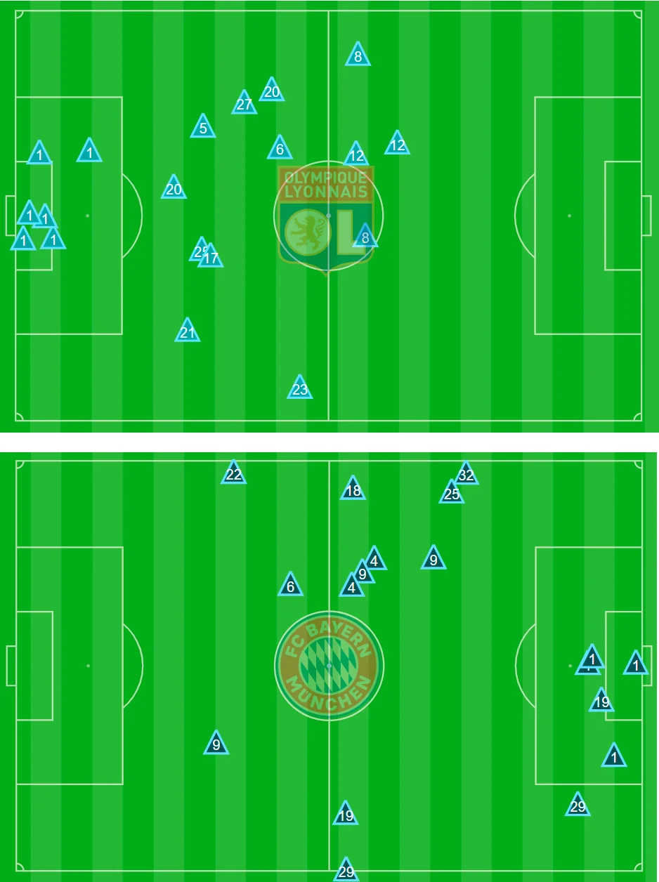 В дальнейшем Лион прижали, однако во втором тайме французы сумели собраться и перехватить инициативу, не отпуская её ко второй половине 70-х минут. Трудно вспомнить ещё один клуб в текущем сезоне, которому это удалось, а найти команду, которая перепрессинговала Мюнхен на в центре поля, вообще нереально – но "ткачам" это удалось. Просто сравните количество удачных оборонительных действий и подборов в этой зоне за указанный период.