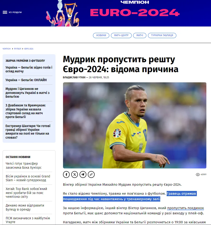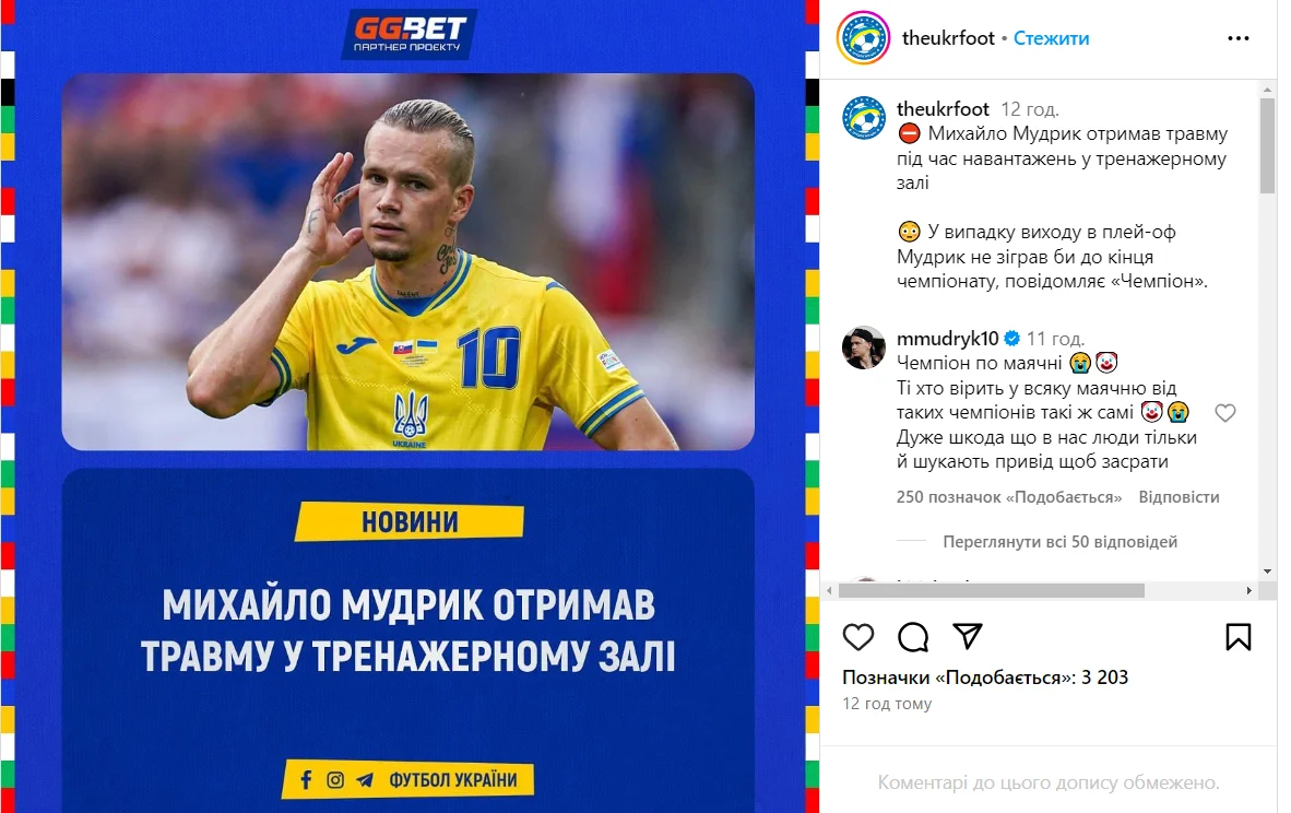 Накануне издание “Чемпион” разродилось инсайдом о причинах отсутствия Михаила Мудрика в матче 3-го тура группового этапа Евро-2024 с бельгийцами. По версии портала, звезда Челси накануне игры получил травму в тренажерном зале. Сам футболист поспешил отреагировать на вышеуказанную информацию в комментариях паблика “Theukrfoot”.