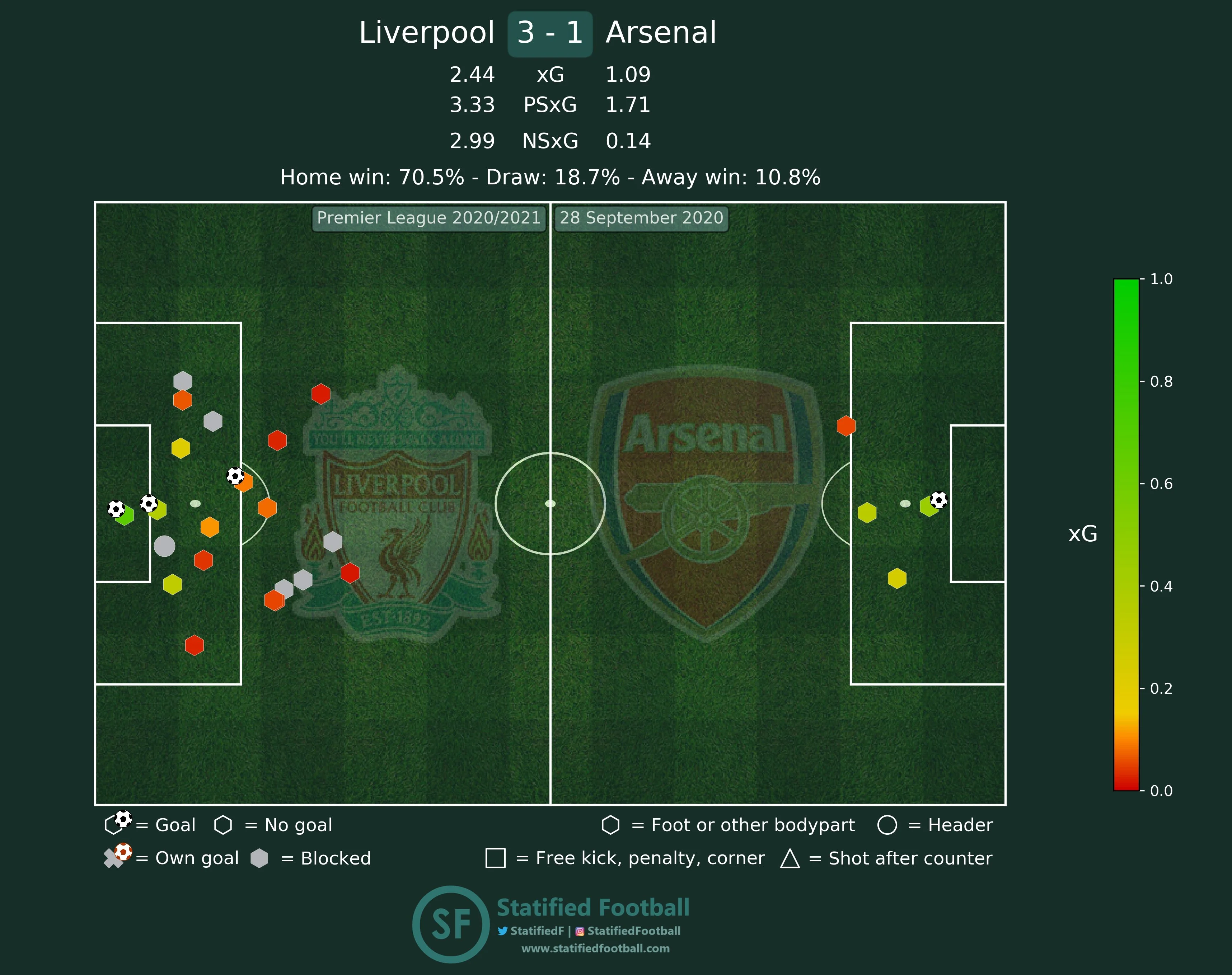Ливерпуль конвертировал своё доминирование и интенсивность в остроту. Уже после 20-й минуты оборону Арсенала раз за разом вскрывали, что и вылилось в два гола. Во втором тайме матч стал равным, но "красные" всё равно регулярно находили свободные зоны и стреляли из опасных позиций. В целом, за весь поединок подопечные Юргена Клоппа наиграли на 2,44 ожидаемых гола, а по статистике ожидаемых голов после ударов и без них эта цифра ещё выше. Преимущество мерсисайдцев в этих компонентах была огромной.