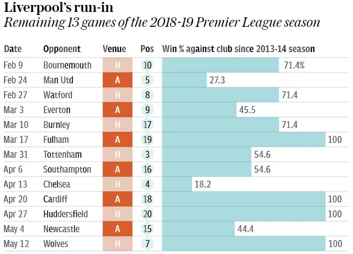 У Тоттенхэма и очков меньше (-5 от Ливерпуля, -2 от Сити), и календарь тяжелее (4 матча с грандами), и винрейт против оппонентов хуже. Лидеры атаки Харри Кейн и Деле Алли травмированы и не помогут "шпорам" на важном отрезке с дерби против Челси и Арсенала.