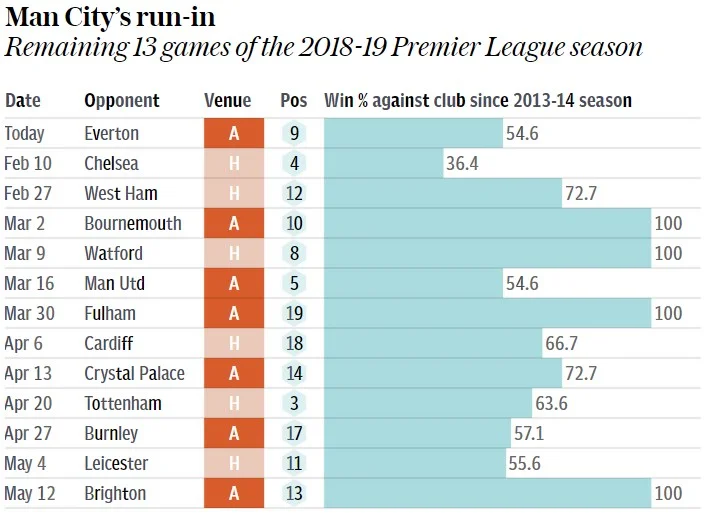 У Манчестер Сити во многом решающей должна стать эта неделя – два сложных соперника, судя по проценту побед. За последние 5 сезонов "горожане" выиграли у Челси только 36.4% матчей чемпионата. Эвертон также выступает неудобным оппонентом для Сити на уровне МЮ. После манчестерского дерби в середине марта Гвардиола будет иметь, как кажется, очень легкий календарь – только представители нижней части турнирной таблицы и Тоттенхэм. Правда, винрейт против некоторых команд довольно низкий.