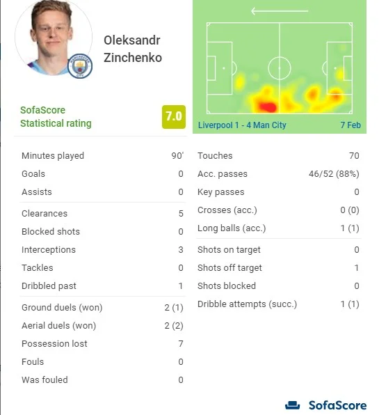 Зина стал вторым в матче по перехватам (3) и выносам (5). Не был столь активен с мячом, как обычно – до перерыва моментами паниковал под прессингом, а когда начал играть попроще и быстрее отдавать партнерам, все наладилось. Играл украинец, на секундочку, против самых острых в нынешнем состоянии Ливерпуля – правых защитника и вингера. Не обошлось без традиционно добротной подстраховки Диаша и опорников, но как и в игре с Челси, Зинченко доказал свое качество защитника на топовые баталии, а это очень и очень высокий статус, учитывая наличие на скамейке запасных Ляпорта и Менди, которые стоили гораздо больше миллионов и также могли бы сыграть слева.