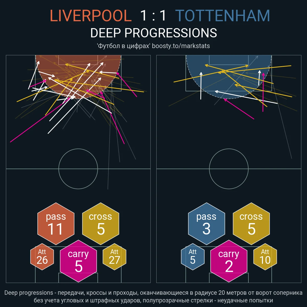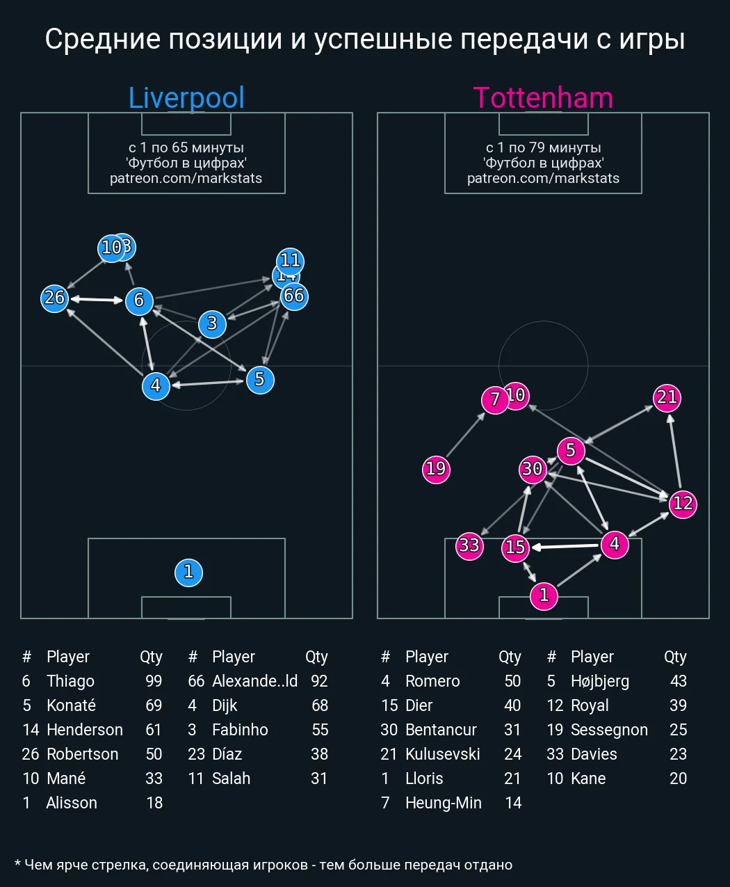 Проблема заключалась в очень интенсивном контрпрессинге Ливерпуля. "Шпоры" теряли мяч слишком быстро и начинали контрвыпады со слишком низких позиций. Так, несколько раз удалось провести фирменные быстрые выходы с разбеганием Сона, Кейна и фулбеков, но этого мало для побед в топ-матчах. Можно также отметить 10 продвижений мяча в штрафную мерсисайдцев – впрочем, практически все они прошли с флангов.