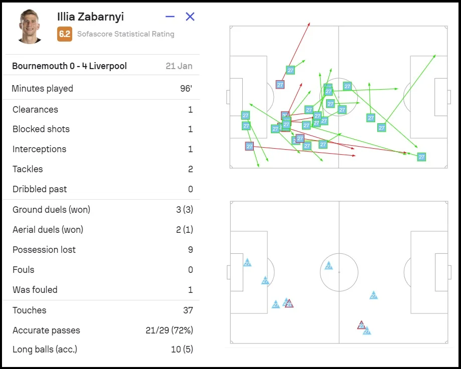 Илья несколько раз прекрасно прочитал игру и оборвал атаки Ливерпуля, а в эпизодах с пропущенными голами вряд ли мог сориентироваться лучше (хотя держал Нуньеса). Забарный доигрывал на правом фланге обороны, потому что Аронс из-за травмы ушел с поля, оставив Борнмут в меньшинстве. Оценки статистических порталов не могли быть высокими: SofaScore – 6.2, WhoScored – 5.6, FotMob – 5.5.