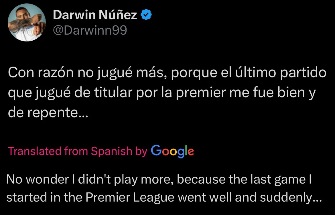 Форвард Дарвин Нуньес в субботу утром (26 апреля) опубликовал туманную жалобу: "Неудивительно, что я не играл больше, потому что мой последний выход в старте на матч АПЛ сложился хорошо, но вдруг...". Уругваец быстро удалил сообщение, однако пользователи соцсетей успели наделать скринов и пытаются догадаться, кому адресованы претензии нападающего.
