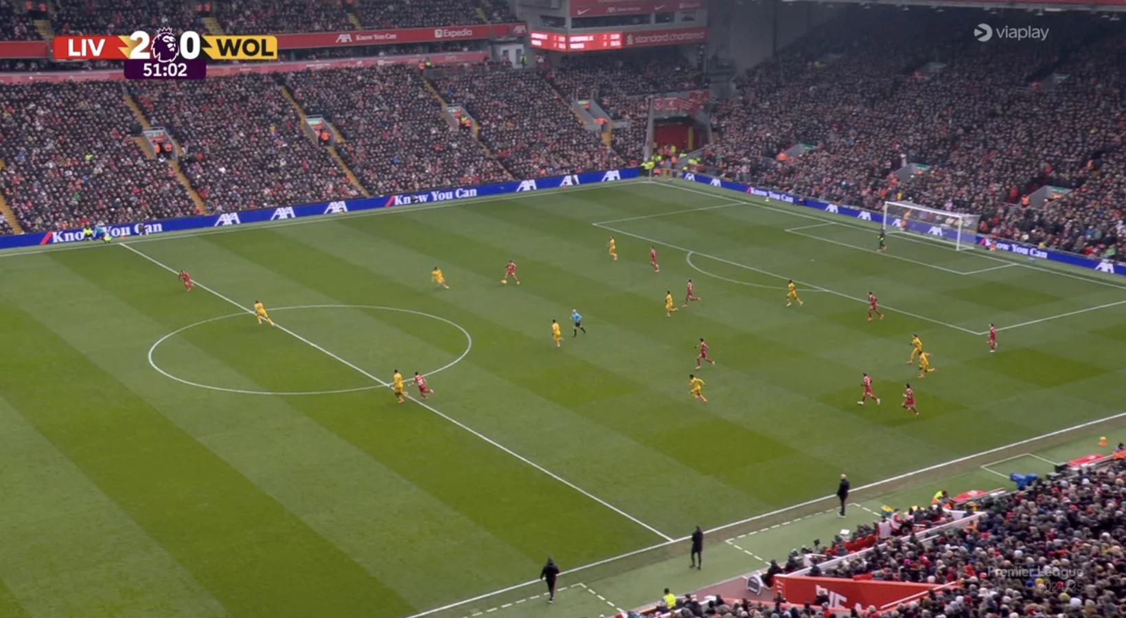 Вулверхэмптон до перерыва сумел огрызнуться только ударом со стандарта в исполнении Куньи. Матео целился в дальнюю девять, но немного не попал. Футболисты ушли отдыхать при комфортном преимуществе Ливерпуля в счете. Казалось, что второй тайм уже можно не смотреть (по крайней мере, фанам Арсенала).