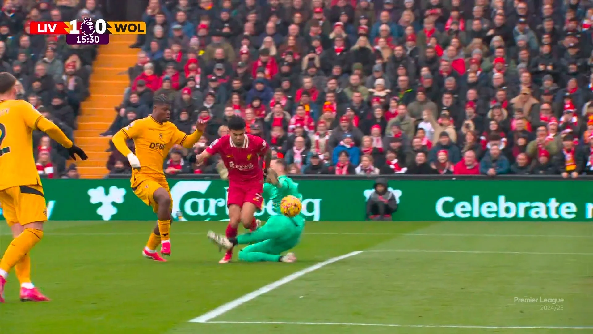 Салах в штрафной принял перевод от Жоты, а защитник выбил мяч из-под его ног – впрочем, мяч полетел обратно, на линию вратарской. Туда прибежал Диас, который уже падал на газон. Тем не менее, сфера все равно отскочила от Луиса, закатившись в сетку. 1:0!