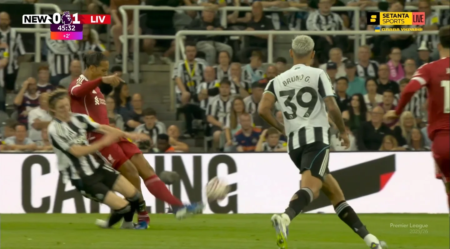 В концовке тайма Ньюкасл остался в меньшинстве – Энтони Гордон жестко влетел в Вирджила ван Дейка. После просмотра VAR бывший игрок Эвертона получил прямую красную карточку.