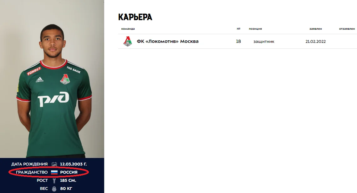 Защитник Локомотива Марк Рене Мампахи на официальном сайте РПЛ указан как гражданин России.