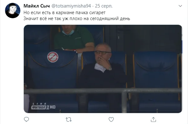 В дебюте матча режиссеры трансляции несколько раз останавливались на президенте Динамо. Игорь Суркис вкусно затягивался сигаретой. Журналист и комментатор текстовых онлайнов Футбол 24 Михаил Юхименко сразу вспомнил классику, которая стала пророческой.