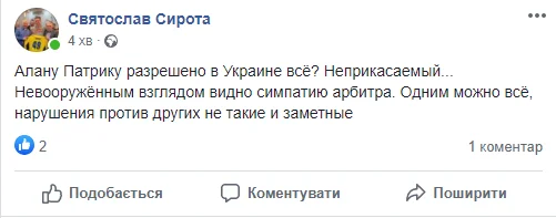 Экс-голкипер Динамо-2, Вереса, Днепра и бывший президент ПФЛ Святослав Сирота красноречиво отреагировал на размашистый первый гол киевлян. А чуть позже набросился на Алана Патрика.