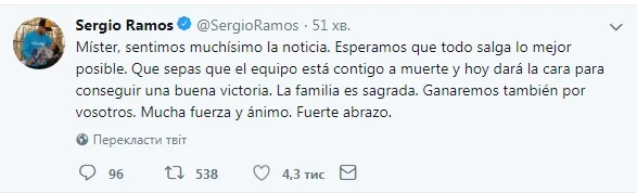 Капитан сборной Испании Серхио Рамос поддержал тренера в соцсетях. "Мистер, мы очень сожалеем из-за этих новостей. Знайте, что команда с вами до смерти и сделает все, чтобы победить сегодня. Семья – это святое. Мы победим для вас. Много сил и смелости. Обнимаем", – написал Рамос в Twitter.