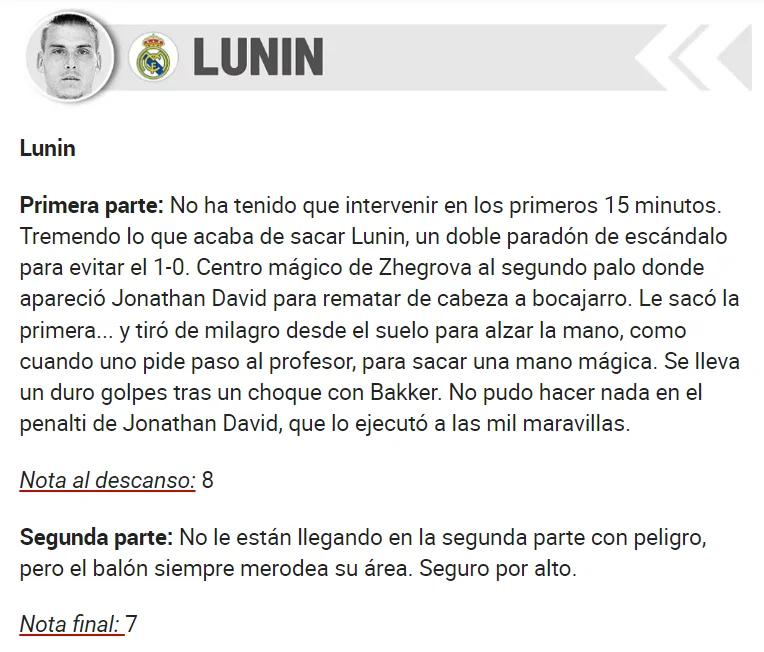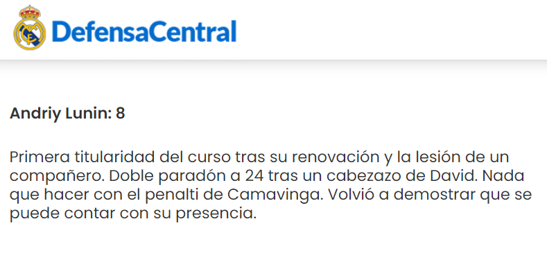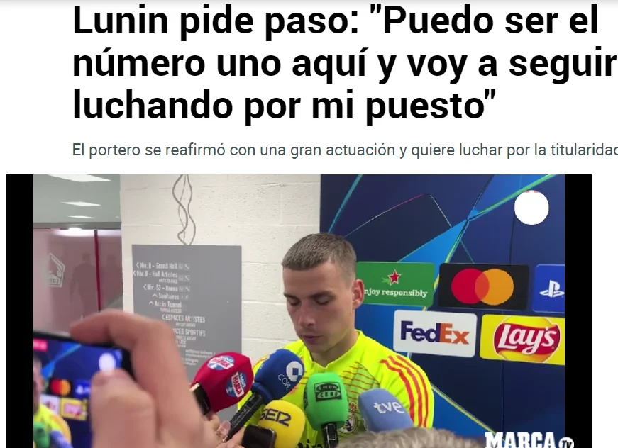 Marca, Хосе Луїс Альєге: Лунін знову з'явився, коли він був потрібен Мадриду. Хоча цього було недостатньо, щоб здобути позитивний результат, голкіпер діяв впевнено і рішуче. У нього непроста ситуація, тому що він конкурує з одним із найкращих воротарів світу – можливо, найкращим – але українець не здається: "Моє продовження контракту – це жест довіри клубу до мене. З першого дня я казав, що Реал – це клуб моєї мрії. Очевидно, що ніхто нічого тобі не дасть просто так, всі бачили, на що я здатний. Я можу бути тут номером один і продовжуватиму боротися за свою позицію з усіх сил. Попри величезну повагу до Куртуа".