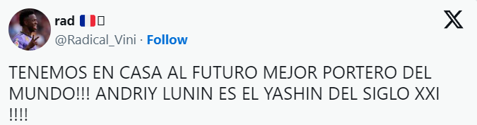@Radical_Vini: У нас вдома вже є майбутній найкращий воротар у світі. Андрій Лунін – Яшин 21 століття.