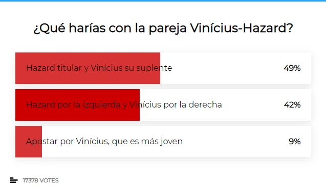 Бразилец только начал становиться ключевым в мадридской команде, как на его позицию купили главную звезду галактического масштаба. Гол Барселоне, ассист при единственном взятии ворот Манчестер Сити – похоже, Винисиус воскрес в последние недели перед форс-мажорной паузой. Однако Эден остается безапелляционным игроком основы. Что же делать в этой паре? Большинство болельщиков Реала за Азара в старте, Винисуса видят в роли джокера (49%). На одного бразильца (мол, он младше) полагаются только 9% респондентов. А сразу 42% читателей считают, что спасением станет перевод 19-летнего направо с сохранением места более опытного бельгийца на левом фланге.