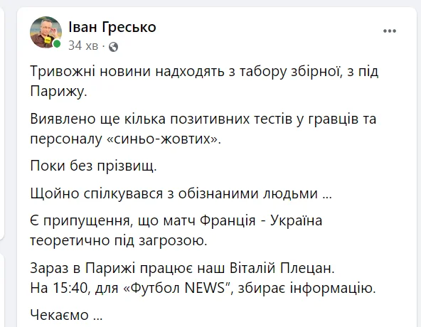 Шеф-продюсер телеканалов "Футбол" Иван Гресько на своей странице в Фейсбуке сообщил, что это может помешать планам сборной Украины. Есть предположение, что завтрашний спарринг против Франции находится под угрозой срыва.