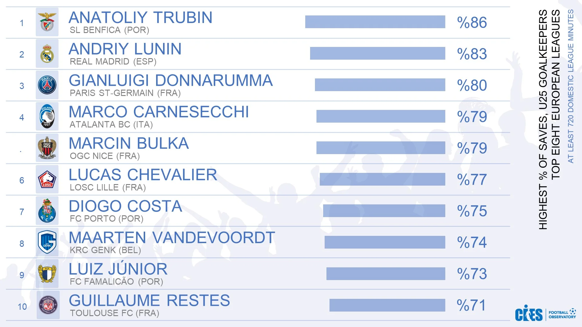 Украинские голкиперы Анатолий Трубин и Андрей Лунин возглавили рейтинг лучших вратарей (до 25 лет) топ-8 европейских чемпионатов по проценту сейвов по версии CIES.