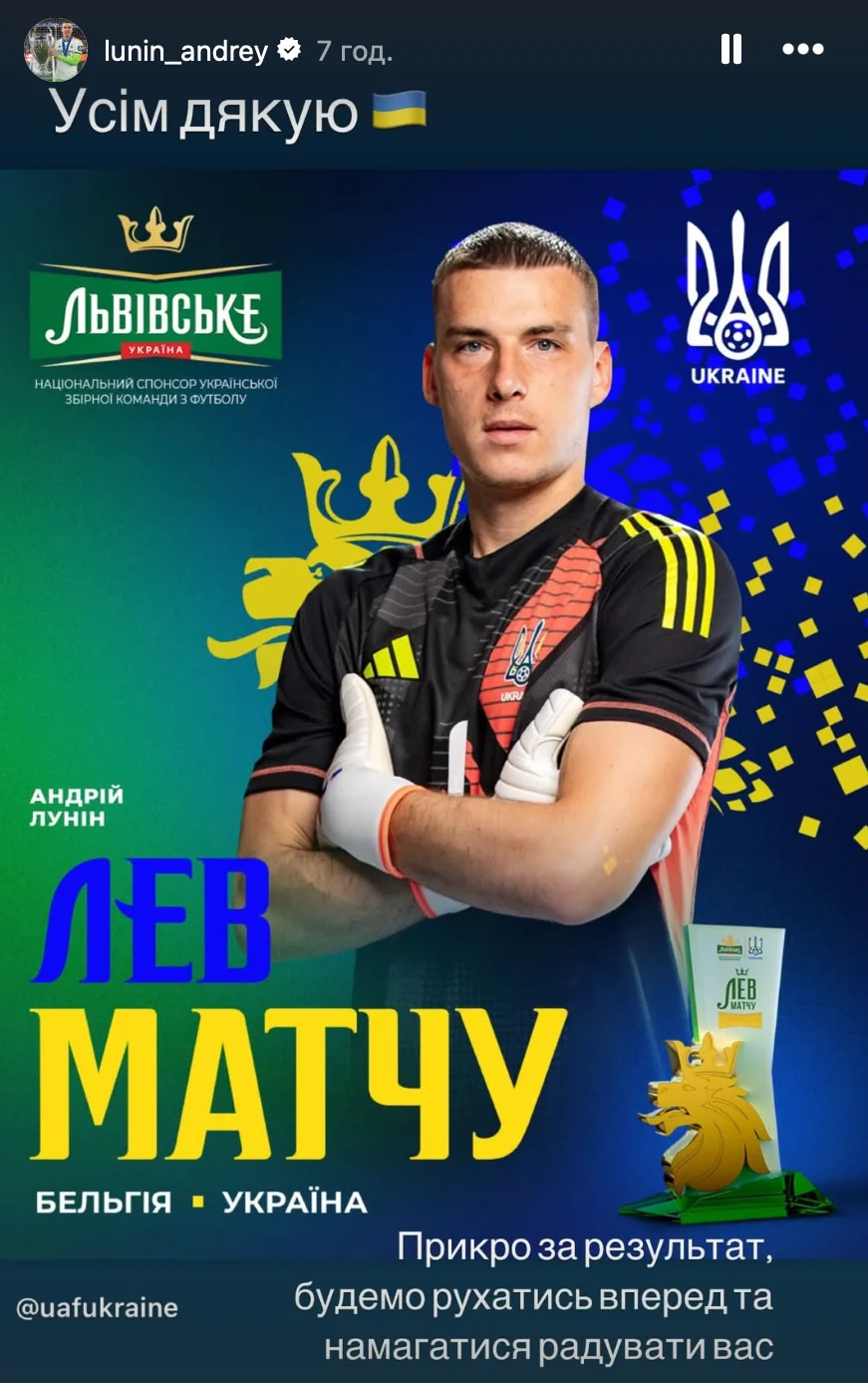 Лунин отреагировал на получение награды "Лев матча" – голкипер сборной Украины обратился к фанатам