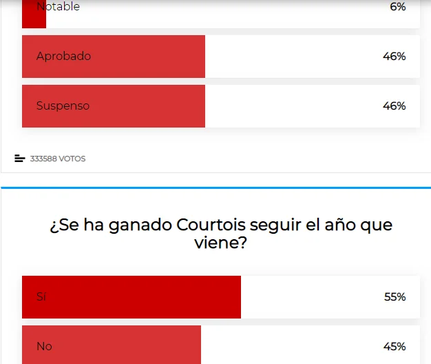 Виступи основного голкіпера Тібо Куртуа оцінили як задовільні та провальні по 46% респондентів. Бельгієць був далеким від своєї форми з ЧС-2018, тож така оцінка цілком закономірна. Утім 55% вважають, що Тібо заслужив шанс залишитись ще на рік.