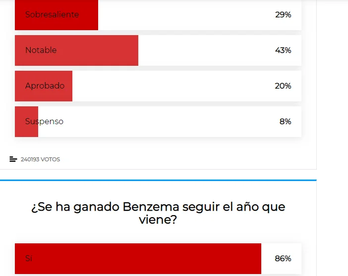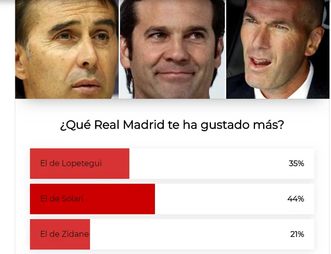 Позитивно період французького головного тренера оцінили лише 8%, задовільно – 34%. Натомість аж 58% вболівальників Мадрида переконані, що Зідан напрацював на 2 бали. Тільки 20% вважають, що короткочасне правління Зізу покращило Реал. Єдине, в чому наставника підтримують, це у вирішенні "питання Бейла" – 53% це сподобалось.
