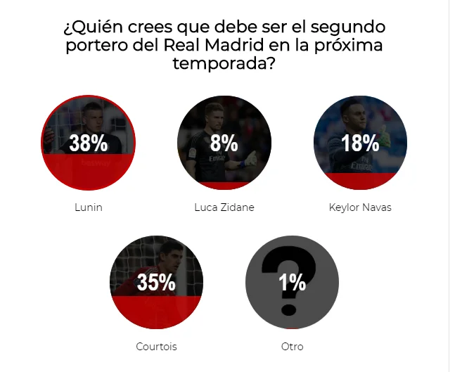 Програє зірковий бельгієць і Луніну в боротьбі за місце 2-го воротаря. За українця в ролі запасного виступають 38%, за Куртуа – 35%. Наваса та Луку Зідана бачать у цій ролі 18% і 8% відповідно.