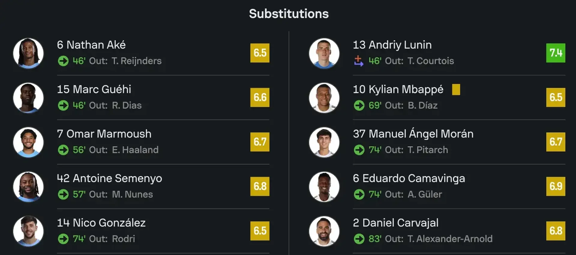 По версии "Футбол 24" Лунин получил оценку – 7,4. Лучшим игроком матча признали Орельена Чуамени – 7,9.