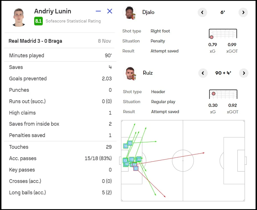 Реал в группе С на своем поле одолел Брагу. В старте неожиданно вышел украинский голкипер Андрей Лунин, заменив Кепу, который травмировался на предматчевой разминке. Уже на первых минутах нашему земляку пришлось сдавать серьезный экзамен – Васкес завалил соперника и арбитр назначил пенальти. Лунин угадал направление удара от Джало и отразил уже 7-й из 14-ти одиннадцатиметровых за время выступлений в Испании.