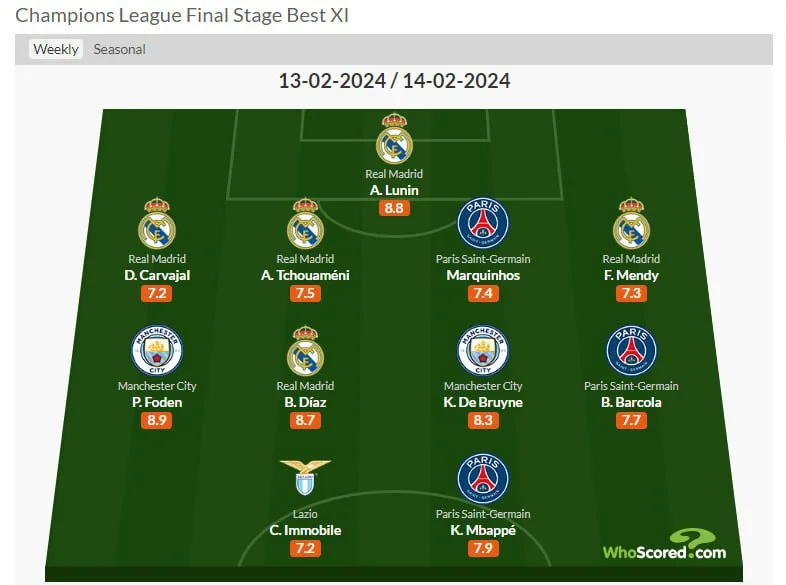 Интересно, что в символической сборной больше всего представителей Реала – сразу пятеро. ПСЖ делегировал в команду трех игрока, Манчестер Сити представлен двумя футболистами, а Лацио ограничился одним исполнителем.