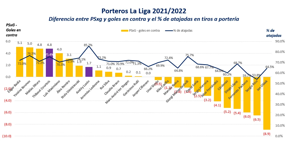 Лунин является абсолютным лидером с показателем 85,7%. Следующий в списке – Ясин Буну (Севилья), у которого 76,6%. Основной вратарь Реала Тибо Куртуа тоже может похвастаться неплохими цифрами – 75,4% (четвертое место). Кроме того, рассчитывалась разница между ожидаемыми голами (показатель xG) и реальными. Здесь Лунин имеет неплохие +1,7, однако до лидера далеко – Эдгар Бадия из Эльче предотвратил 5,1 гола. Худший неожиданно Ян Облак (Атлетико), который напропускал на 8,9 голов больше, чем должен.