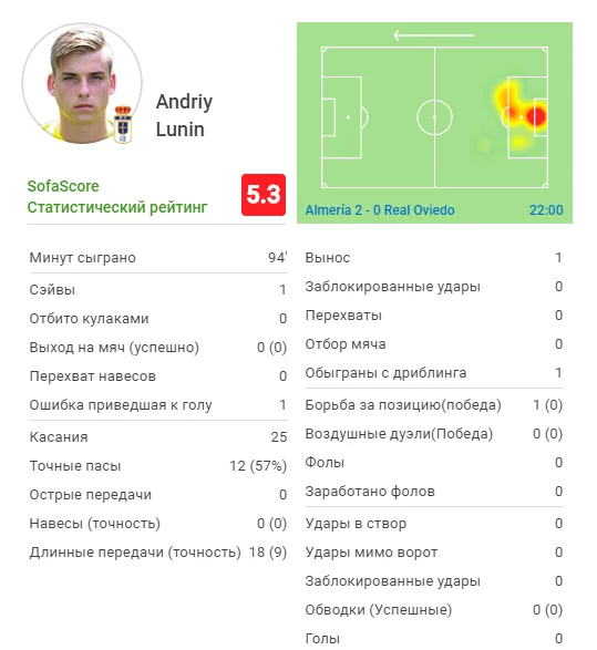 На 73-й минуте украинец стал своеобразным "антигероем" матча: он вышел далеко из ворот навстречу нападающему Альмерии, проиграл борьбу и Нуньесу оставалось лишь закатить мяч в пустые ворота.