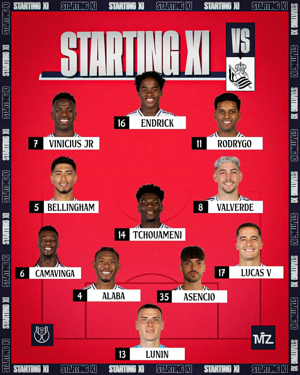 Запасные: Гонсалес, Местре, Мбаппе, Модрич, Гюлер, Вальехо, Гарсия, Браим Диас, Рюдигер