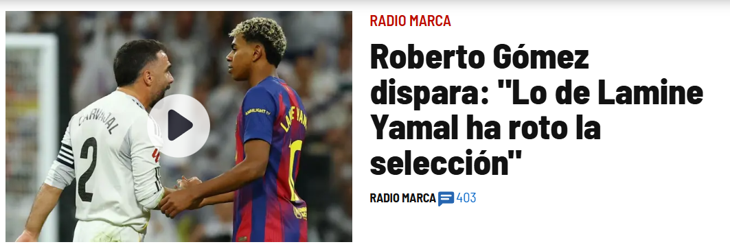 Ламіна критикують не менше. На думку авторитетного Роберто Гомеса з Radio Marca, провокації 18-річного хлопчиська ризикують нашкодити національній збірній перед ЧС-2026. Через схожі проблеми "Ла Роха" вже проходила у 2010-2012 роках. Тоді запекле суперництво з Моурінью й Пепом переросло у люту ненависть. Гравці Барси та Реала майже не спілкувались, і лише мудрець дель Боске зумів усіх помирити. Досвідченому Карвахалю, капітану збірної, теж дістається за перепалку з Ямалем. "Це руйнує іспанський футбол. Наслідки можуть бути жахливими", – підкреслює журналіст. 67% респондентів Marca вважають Ламіна головним винуватцем скандалу. У мадридському ЗМІ не могло бути інакше...