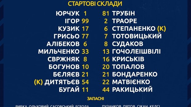 Шахтер: Трубин – Гочолейшвили, Ракицкий, Матвиенко, Топалов – Степаненко, Бондаренко – Крыськив, Тотовицкий, Судаков – Траоре
