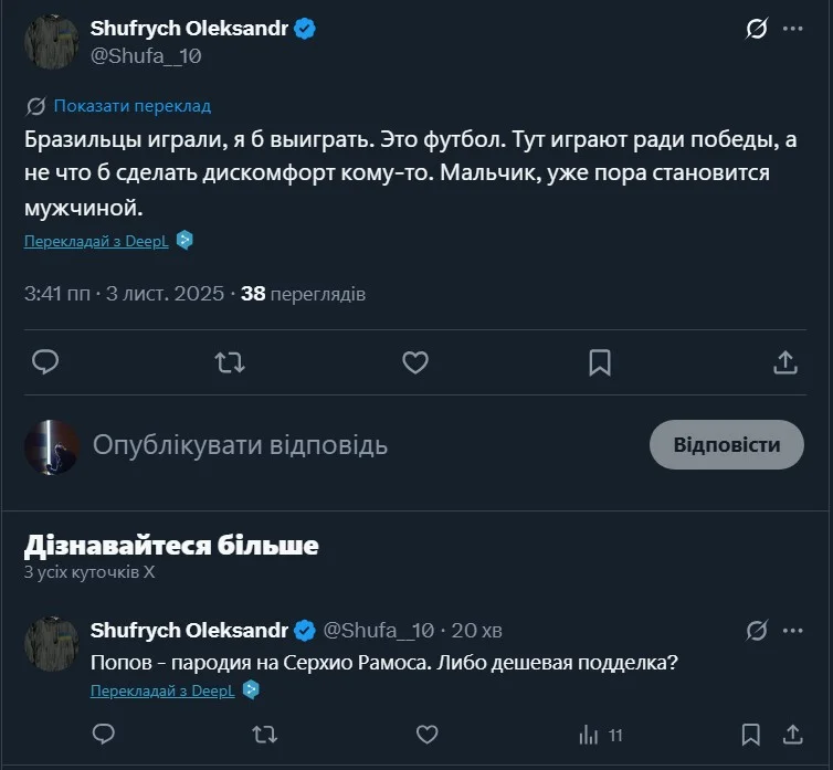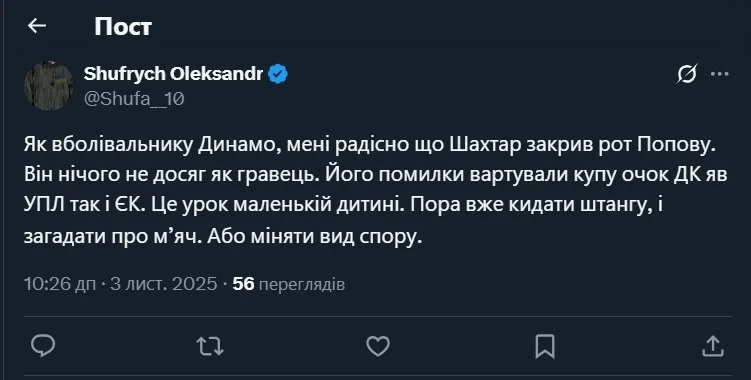"Как болельщику Динамо, мне радостно что Шахтер закрыл рот Попову. Он ничего не достиг как игрок. Его ошибки стоили кучу очков Динамо как в УПЛ, так и в еврокубках. Это урок маленькому ребенку. Пора уже бросать штангу, и загадать про мяч (дословная цитата – прим.). Или менять вид спорта.
