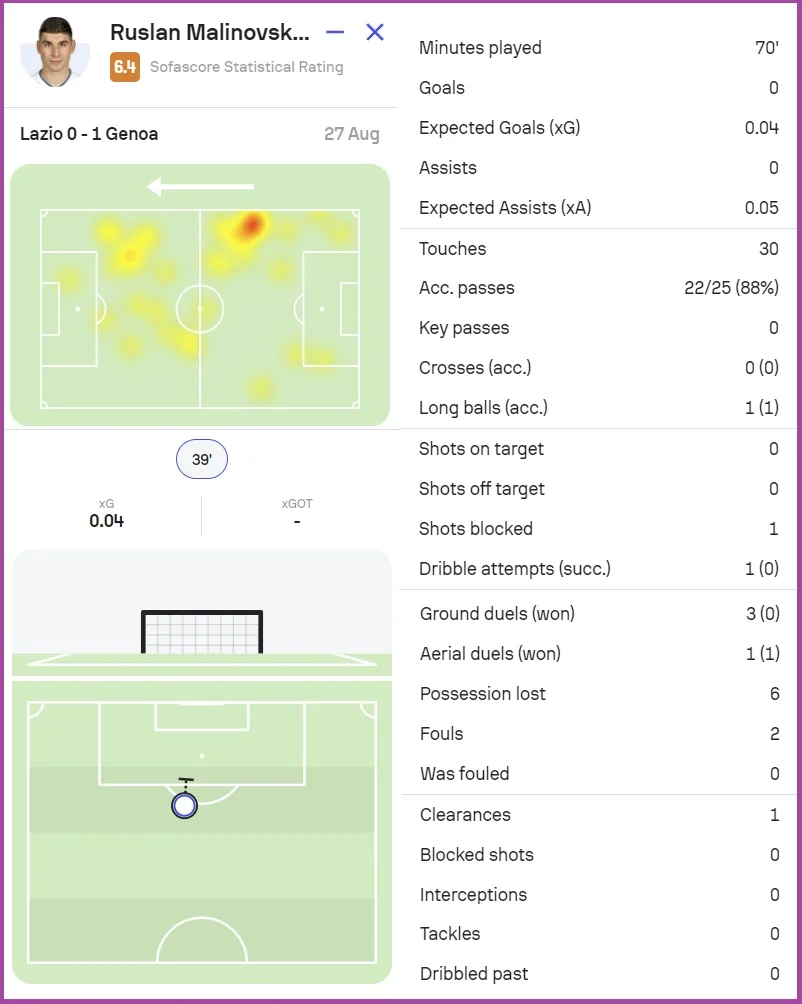 Малиновский получил самую низкую оценку в команде от статистических порталов: SofaScore – 6.4, WhoScored – 6.2, FotMob – 6.1.