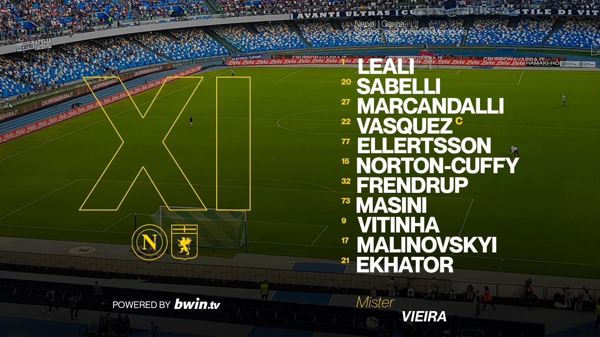 Стартовый состав Дженоа: Леали, Нортон-Каффи, Васкес, Экатор, Френдруп, Масини, Витинья, Малиновский, Эллертссон, Маркандалли, Сабелли