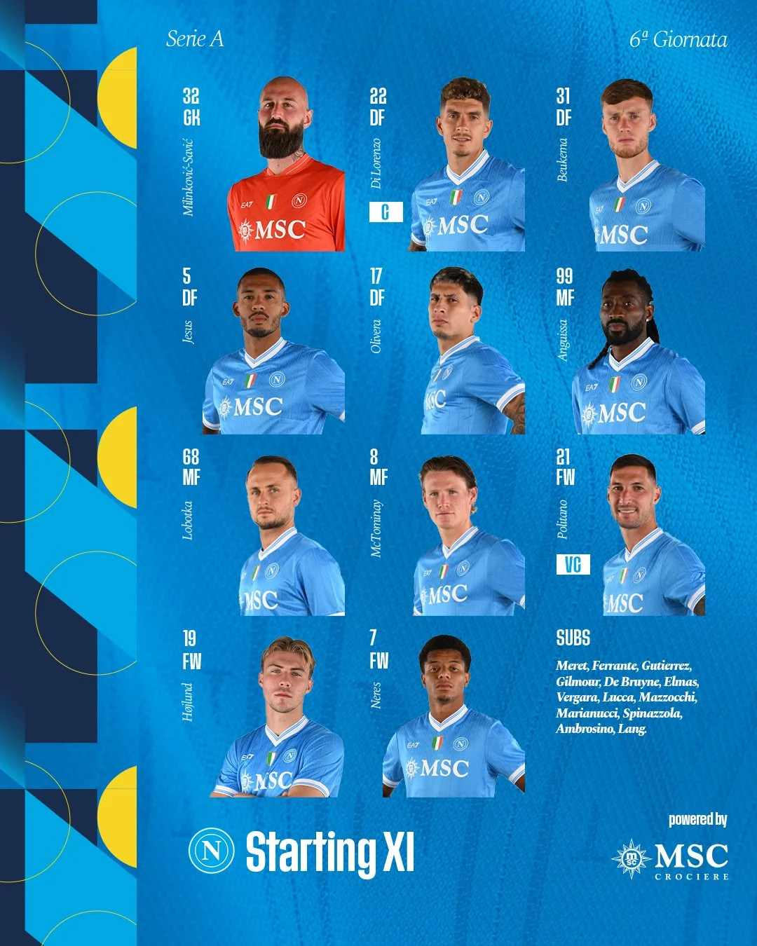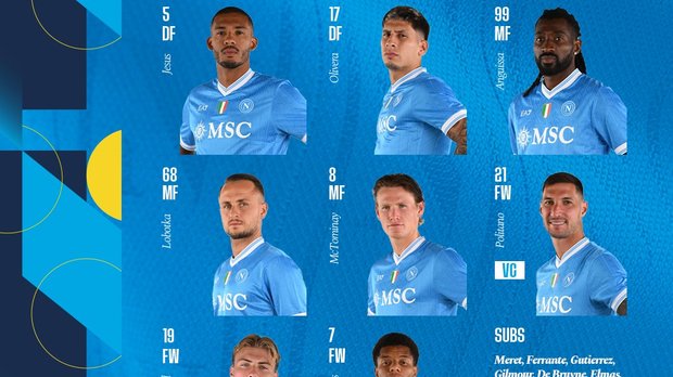 Стартовый состав Наполи: Милинкович-Савич, Оливера, Жуан Жезус, Беукема, Ди Лоренцо, Лоботка, Нерес, Мактоминай, Замбо-Ангисса, Политано, Хёйлунд