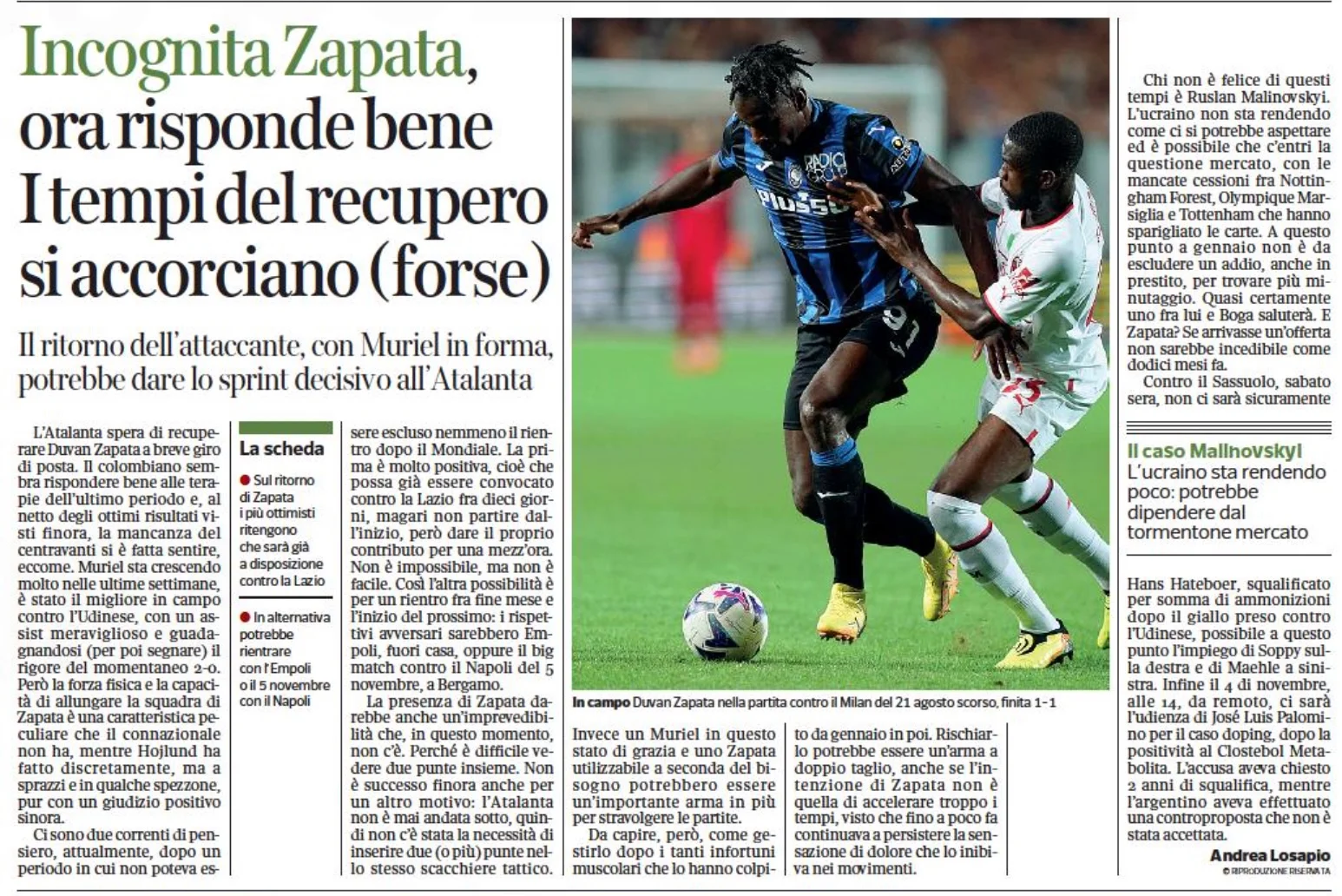 Аталанта разочарована формой Малиновского в дебюте чемпионата, сообщает Corriere di Bergamo. За 9 туров Серии А он всего 4 раза появлялся в стартовом составе. Результативность также не впечатляет – гол + ассист. Возможной причиной неудач называют то, что украинец расстроен своей ролью в команде.